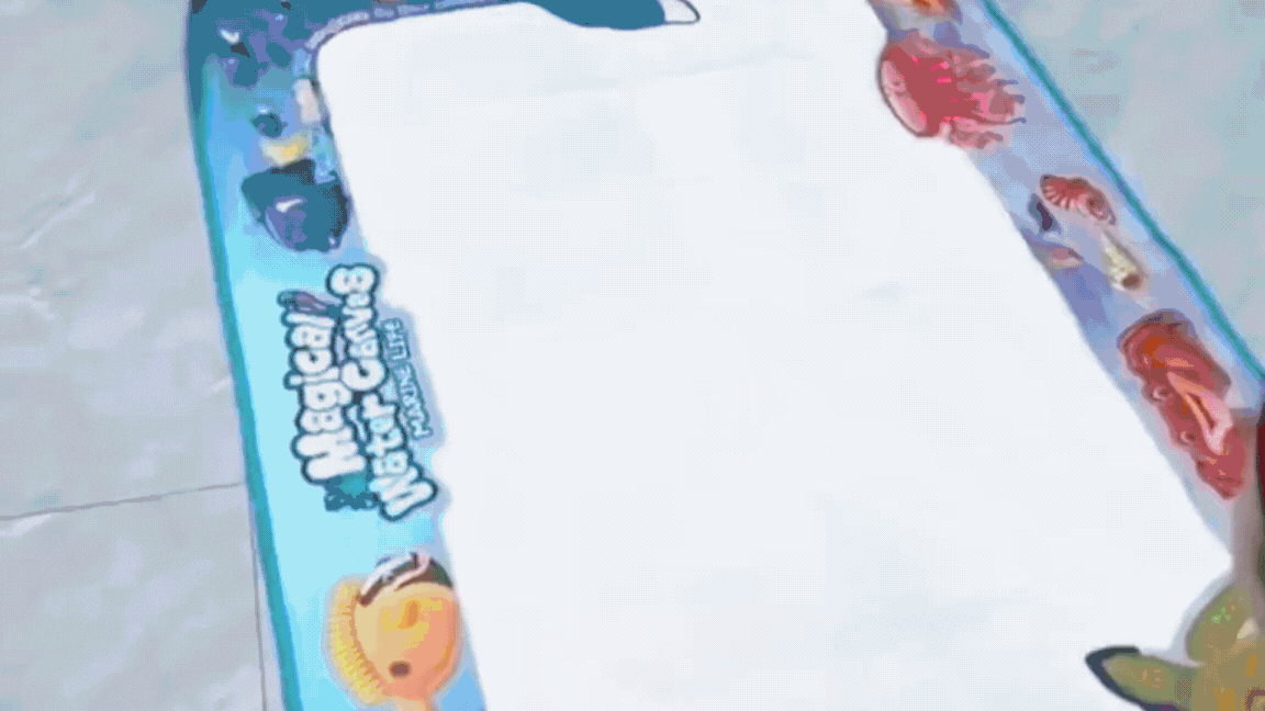 Il suffit de le remplir d’eau du robinet. En dessinant sur le tapis, les motifs apparaissent en couleur, puis disparaissent en séchant pour recommencer à l’infini.